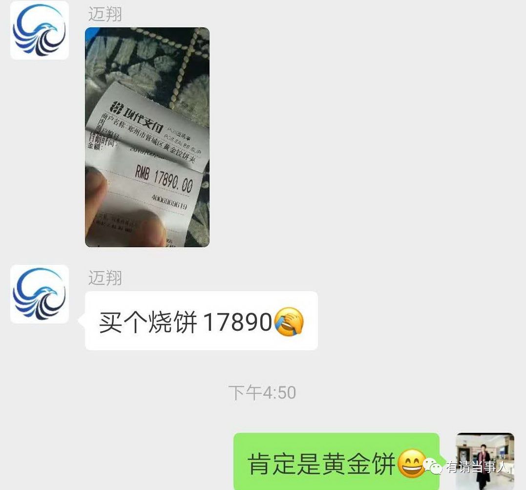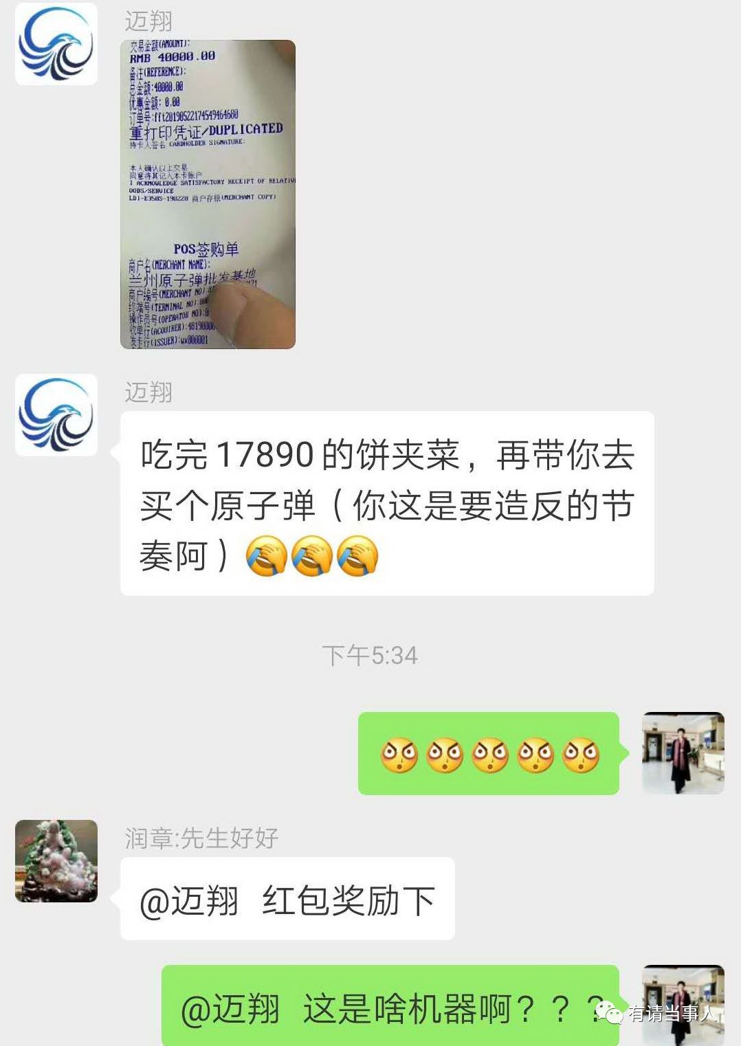 看到这一幕,你是不是顿感懵逼,有种被雷劈的感觉?这一幕不仅惊呆吃瓜群众,就连“迈翔”自己也在微信调侃:“吃完17890的饼夹菜,再带你去买个原子弹(你这是要造反的节奏啊)”!